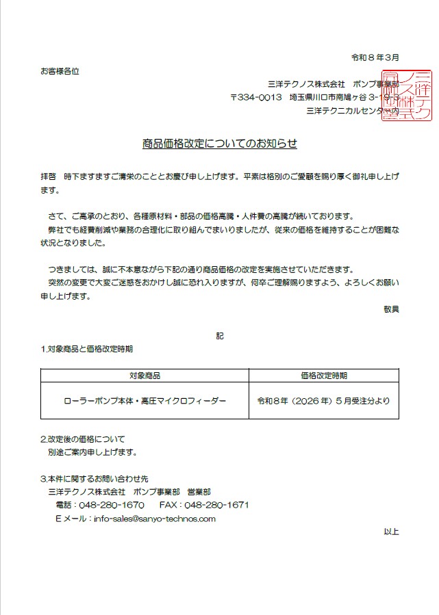 ローラーポンプ(チューブ式ポンプ)のことは ポンプ事業部お問い合わせ
