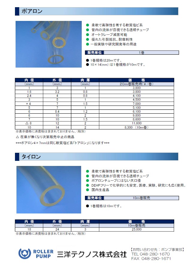 ポアロン ポアロン 軟質塩ビ系のチューブでローラーポンプでも使用可能な無色透明チューブです。 柔軟で高弾性を有し、オートクレーブ滅菌が可能で一般的な実験や研究開発等に幅広く使用されています。 カタログを見る 1巻規格 20m巻(※印は10m巻) 販売単位 20m巻、10.0×14.0(mm)サイズは10m巻 サイズ一覧 内径(mm) 外径(mm) 肉厚(mm) 1.0 3.0 1.0 1.6 3.2 0.8 2.4 4.0 0.8 3.0 5.0 1.0 4.0 7.0 1.5 5.0 7.0 1.0 6.0 8.4 1.2 6.0 10.0 2.0 7.0 10.0 1.5 8.0 12.0 2.0 ※10.0 14.0 2.0 4.0×7.0(mm)および8.0×12.0(mm)は在庫がなくなり次第、販売中止となります。お早めにお買い求めください。 カタログ・説明書・図面 カタログを見る